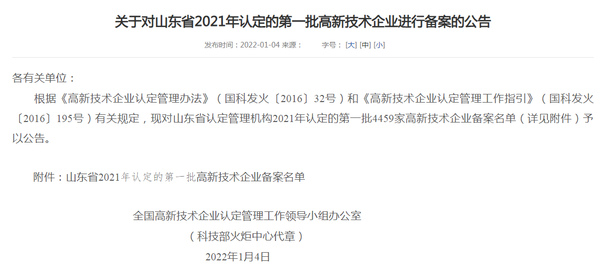近日,山東省高企業(yè)認(rèn)定管理工作網(wǎng)公布了《關(guān)于對(duì)山東省2021年認(rèn)定的diyi批企業(yè)進(jìn)行備案公示的通知》,