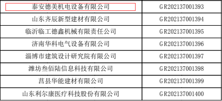 泰安德美機(jī)電設(shè)備有限公司成功入選“山東省2021年認(rèn)定的diyi批企業(yè)”。