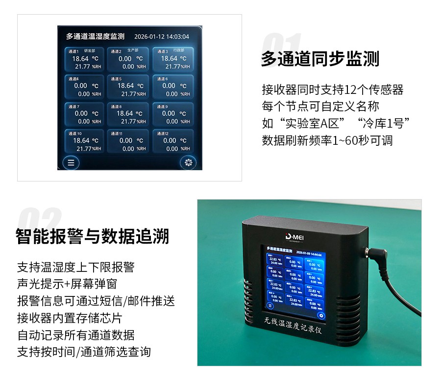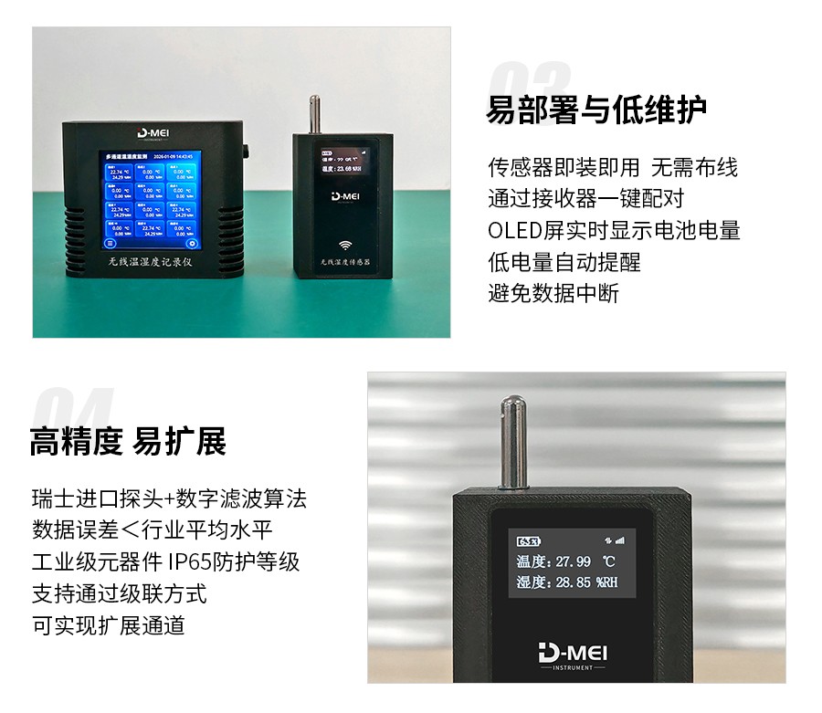 無線溫濕度采集系統(tǒng)是一款高精度、多通道、易部署的環(huán)境監(jiān)測(cè)解決方案,由無線溫濕度傳感器和無線接收器兩部分組成。系統(tǒng)采用瑞士Sensirion原裝溫濕度探頭,結(jié)合2.4G無線通信技術(shù)與工業(yè)級(jí)顯示模塊,支持多只傳感器同步監(jiān)測(cè),適用于實(shí)驗(yàn)室、倉(cāng)儲(chǔ)、農(nóng)業(yè)大棚、機(jī)房等多場(chǎng)景的溫濕度實(shí)時(shí)監(jiān)控與數(shù)據(jù)追溯。