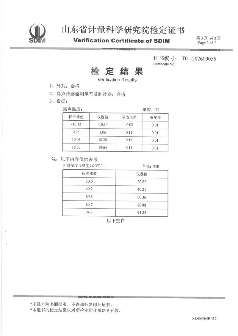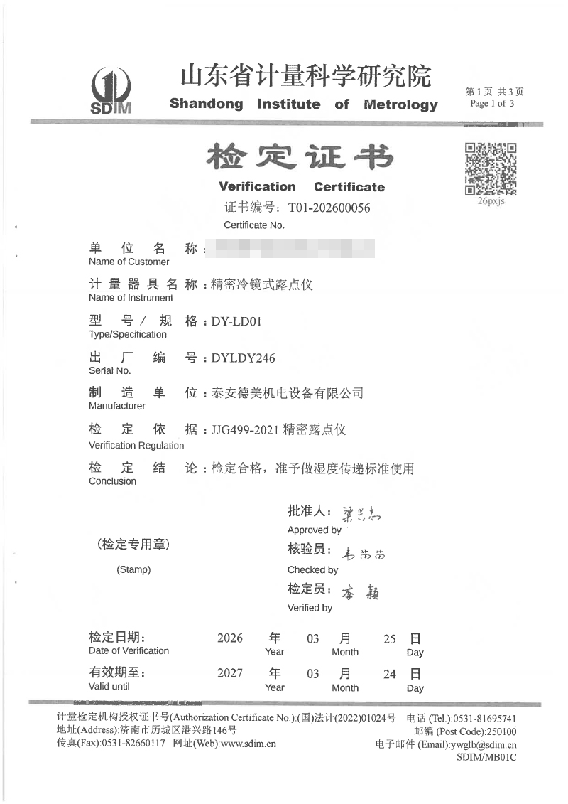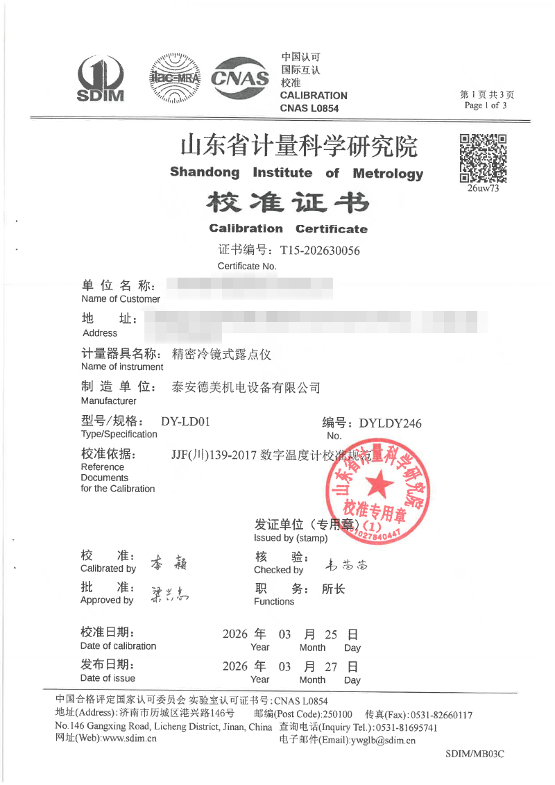 露點(diǎn)儀校準(zhǔn)、檢定證書